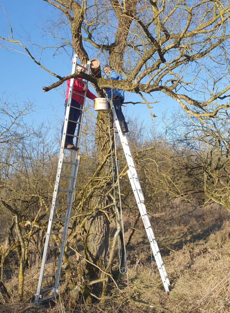 Durch den Verlust natürlicher Brutplätze ist der Steinkauz auf Hilfe angewiesen. Die neue Höhle soll ihm eine sichere Brutmöglichkeit bieten, denn jede Nisthilfe ist ein Beitrag zum Artenschutz. Der Sandwinkel bietet mit seinen offenen Flächen und alten Bäumen ideale Bedingungen für das Leben des Steinkauzes, und so hoffen wir, dass er die Bruthöhle annimmt.